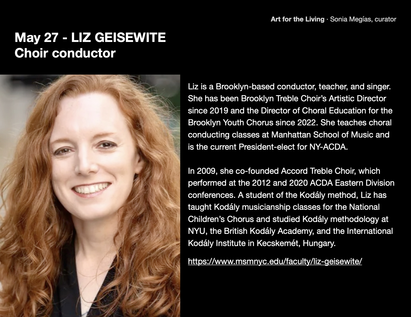 Our last guest is choral conductor Liz Geisewite, who is also the president of the American of Choral Directors Association in New York.