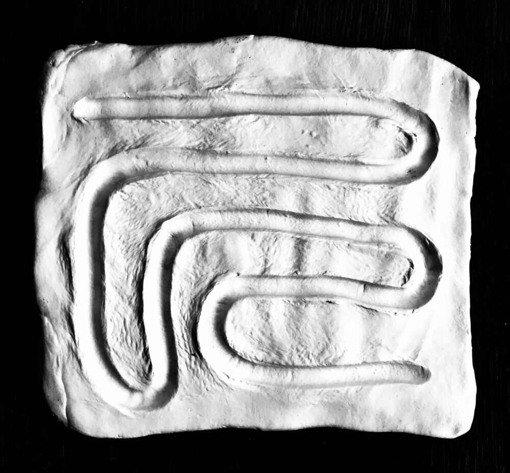 Tactile score made of four clay plates, each one with a different path but all four related to each other. Performers have to follow curves and straight lines of their path with her/his finger, as slowly as possible. Each one is able to start in different moments but must end at the same time.