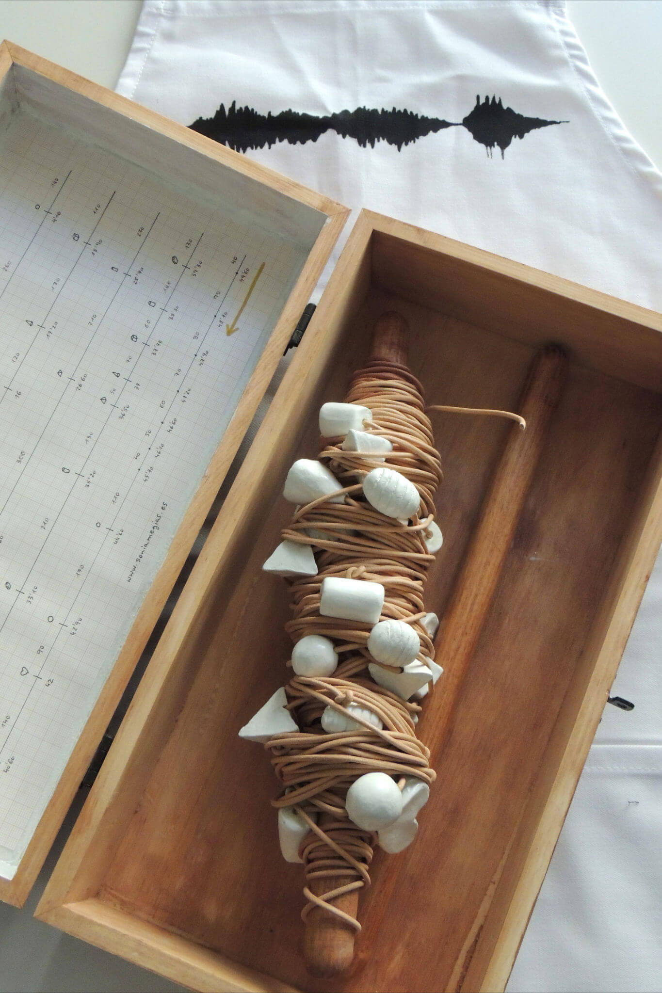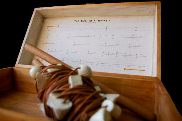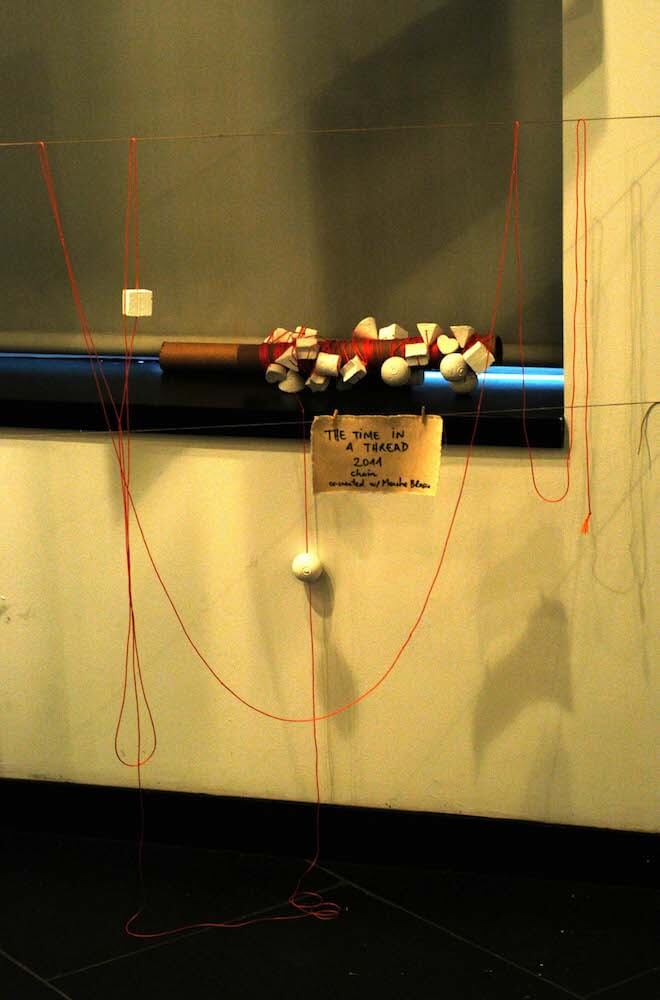 Segunda versión (Madrid, 2012’X): hilo de cuero de 50 metros con cuentas geométricas moldeadas en arcilla blanca.